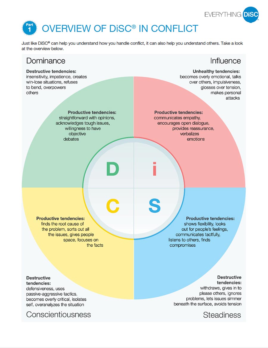 Your DiSC Style in Conflict: The Profile contains highly personalized information that is specific to a participant's responses to the assessment and to their corresponding DiSC style.